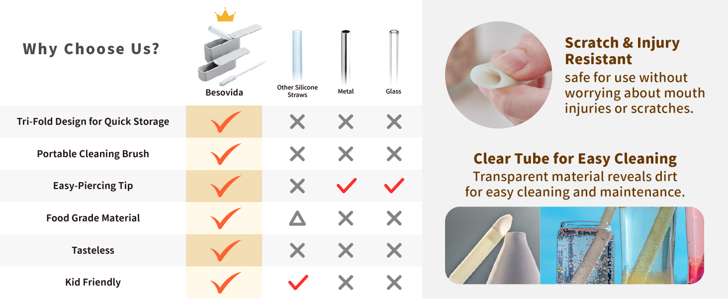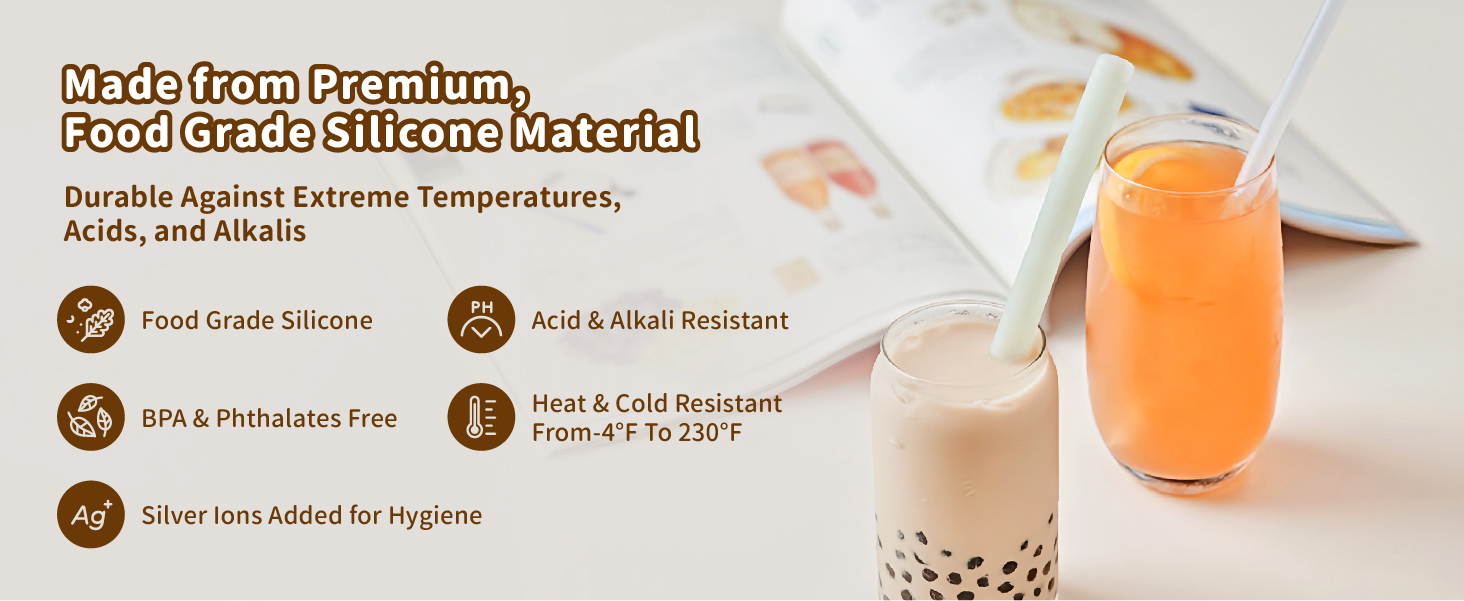 • Baking-Grade Silicone: Outer layer of thick and thin straws, cleaning brush.