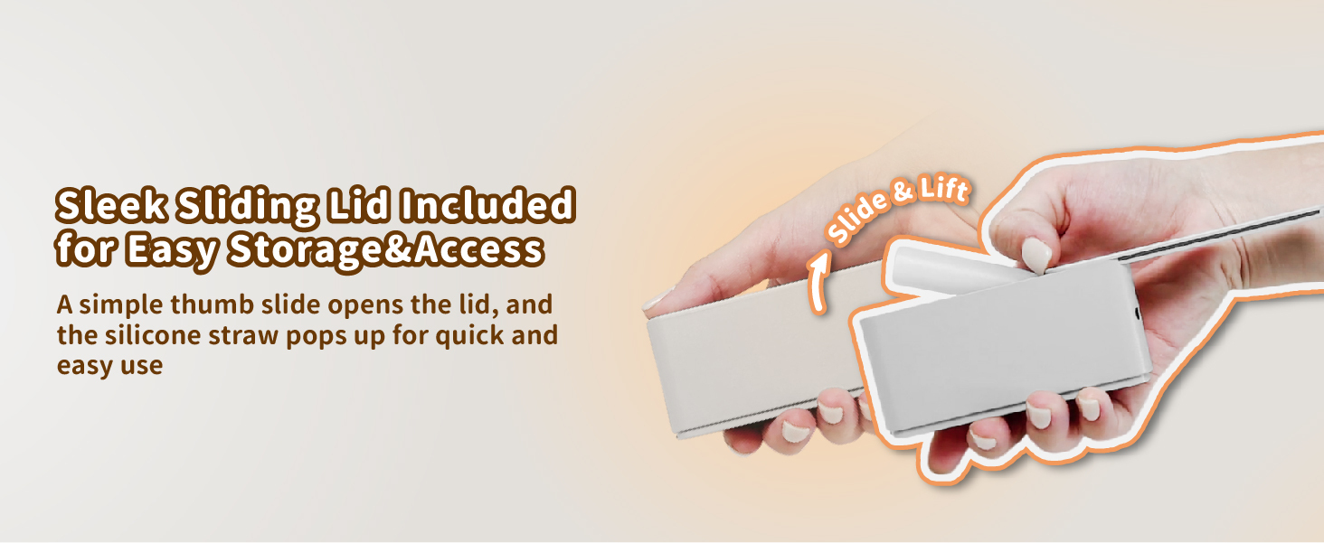 • Insert the sharp end of the straw into the case, pressing it against the inner side of the case. Then, gently push the straw downward until it is fully inside, and close the sliding lid to complete storage.