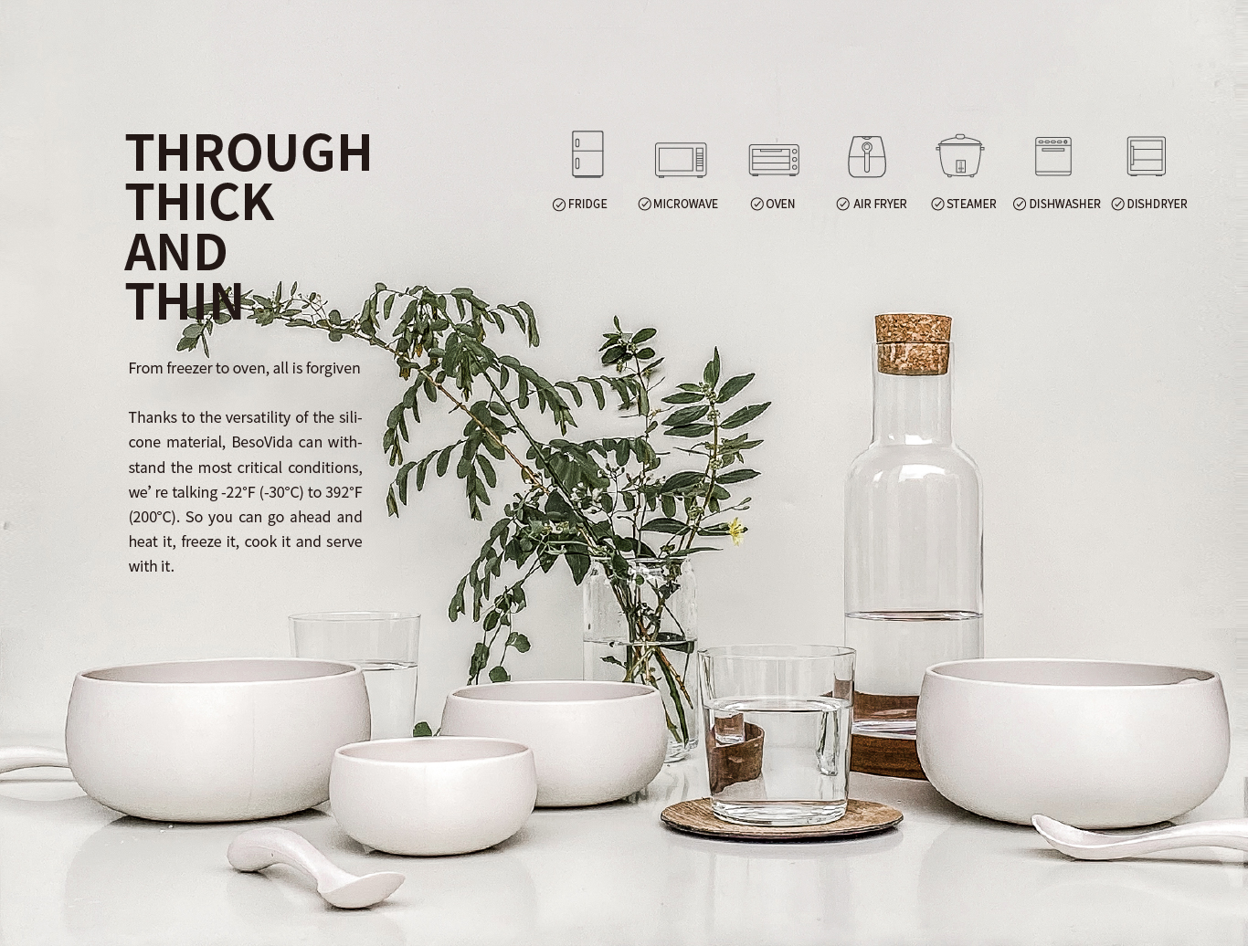 Besovida will not crack or melt even when removed from theoven (200°C) and placed under freezer (-30°C). Oven safe - up to (200°C)Microwave safe - up to (200°C) Dishwasher safe Freezer safe (-30°C)