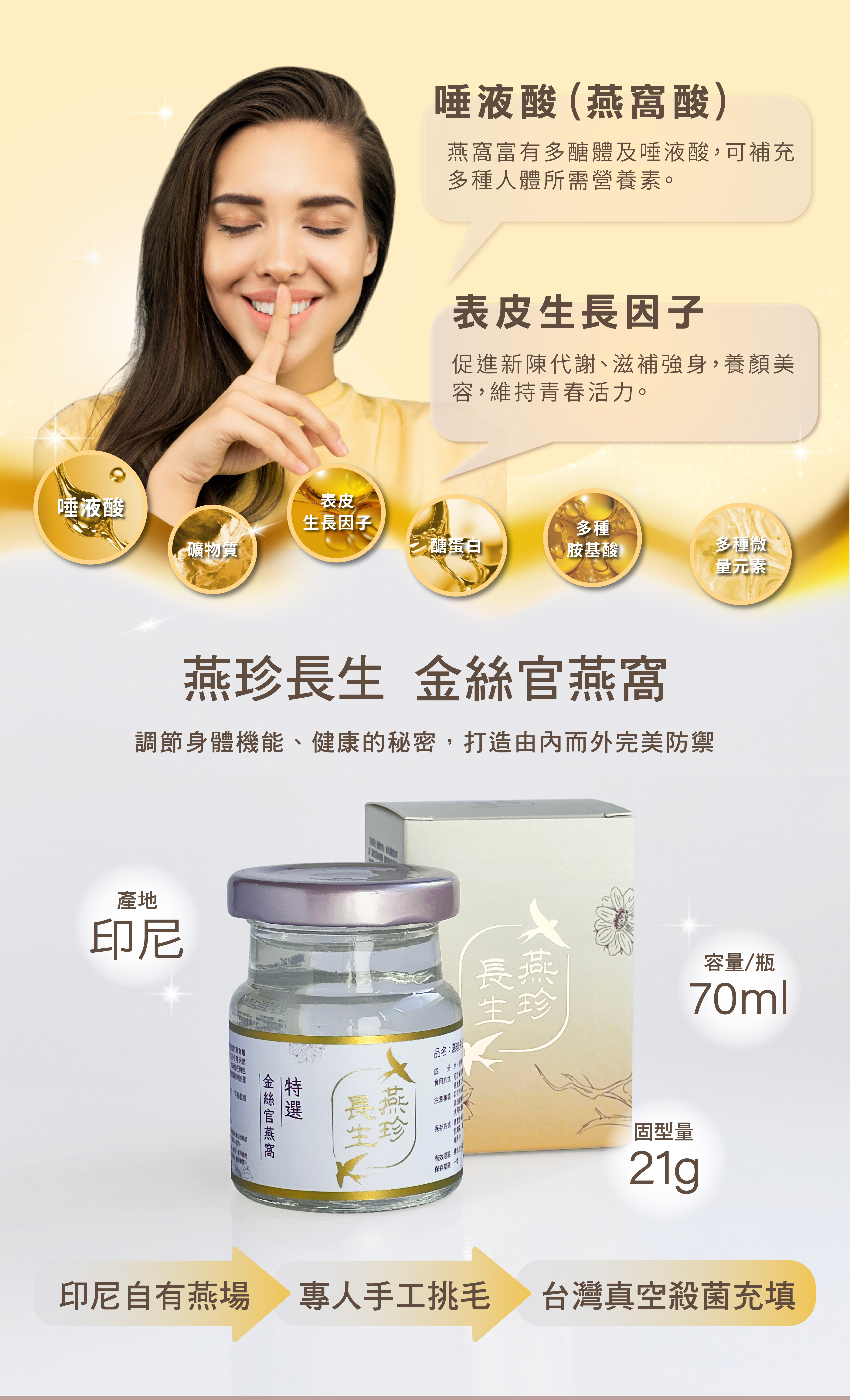 燕窩含有豐富的唾液酸和EGF,這些成分有助於促進新陳代謝、滋補強身,養顏美容、維持健康美麗。