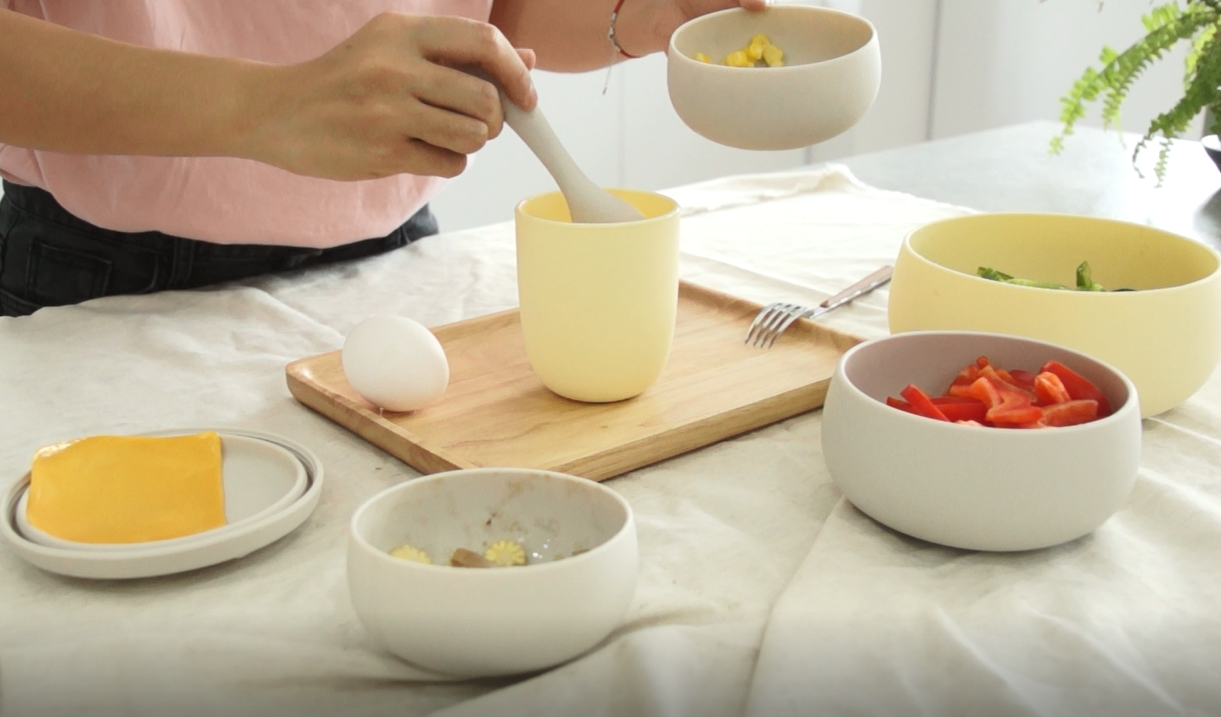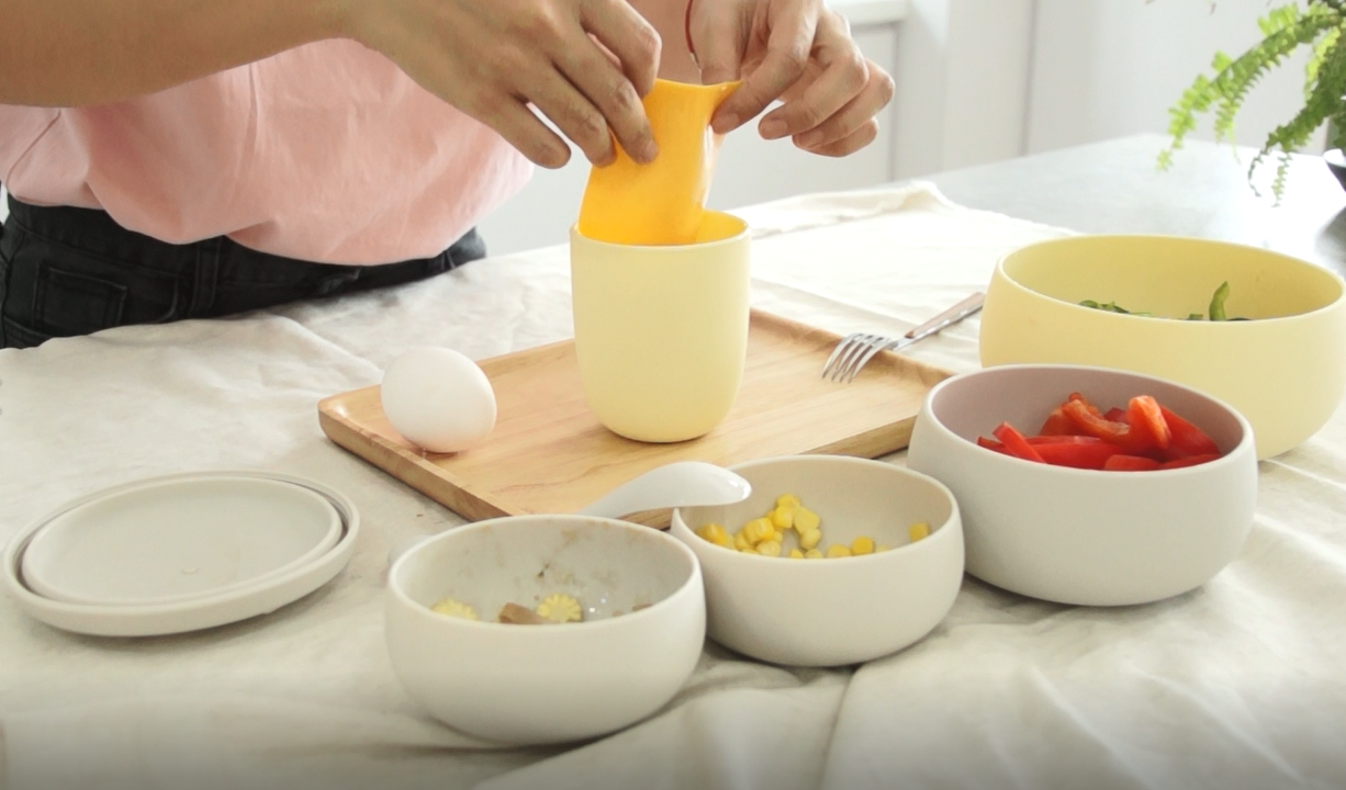 將準備好的蔬菜配料放入小雙杯,可依個人喜好選擇玉米、番茄、青椒...