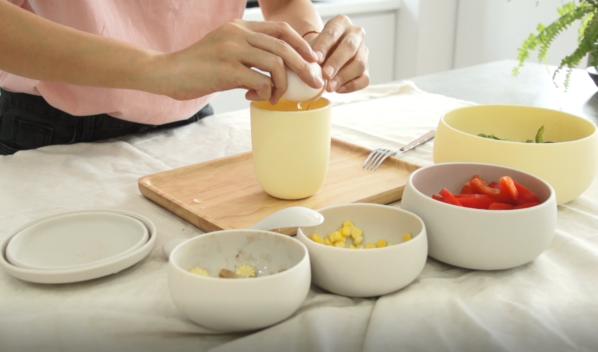 接著打入一顆蛋,並將蛋黃戳洞,微波加熱1分鐘後,就完成雞蛋火腿起司蔬食杯囉