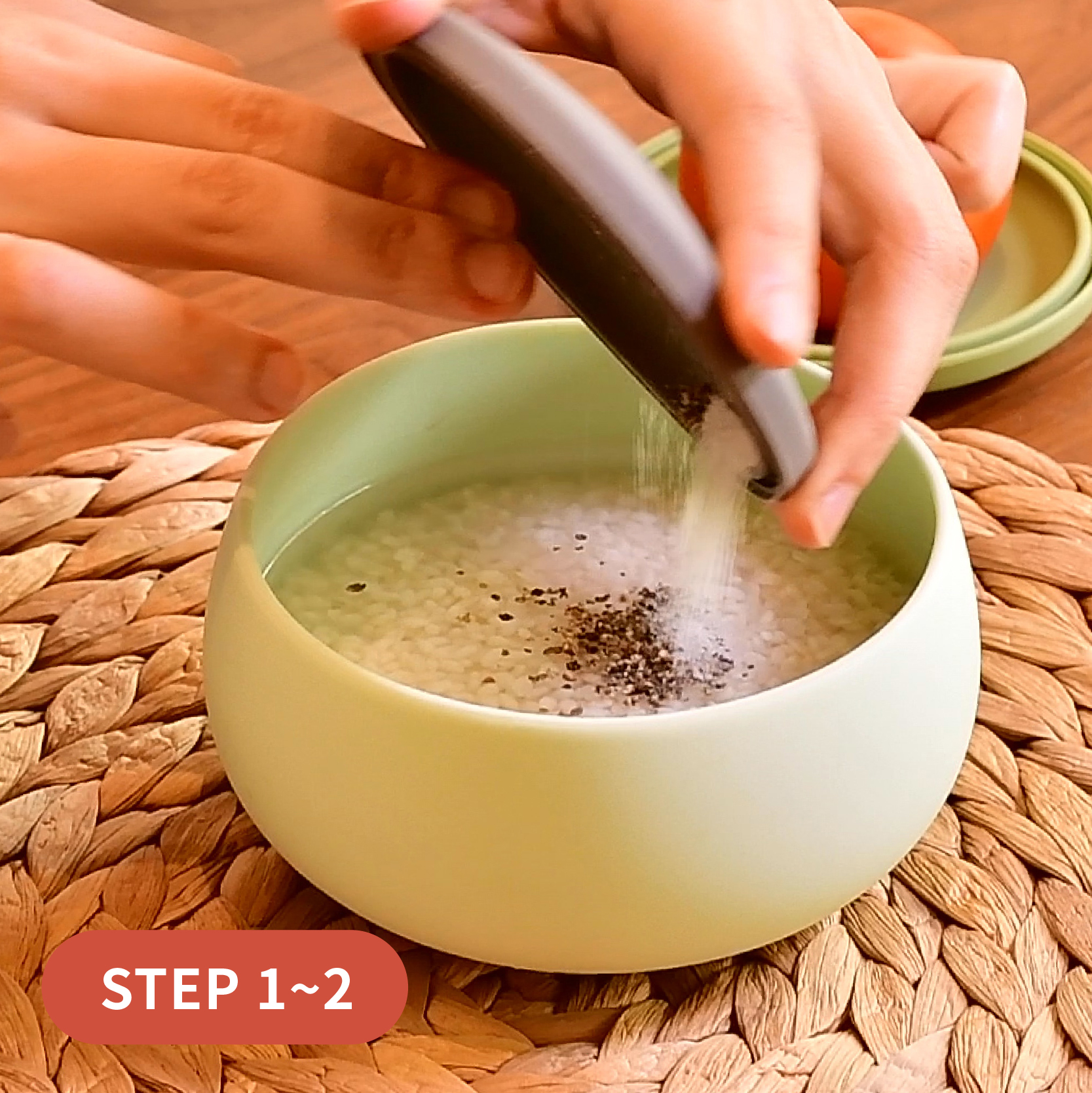 洗好米後,倒入與米等量的水進雙雙中,並加入1匙鹽與半茶匙的黑胡椒,攪拌均勻