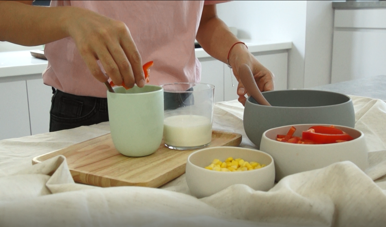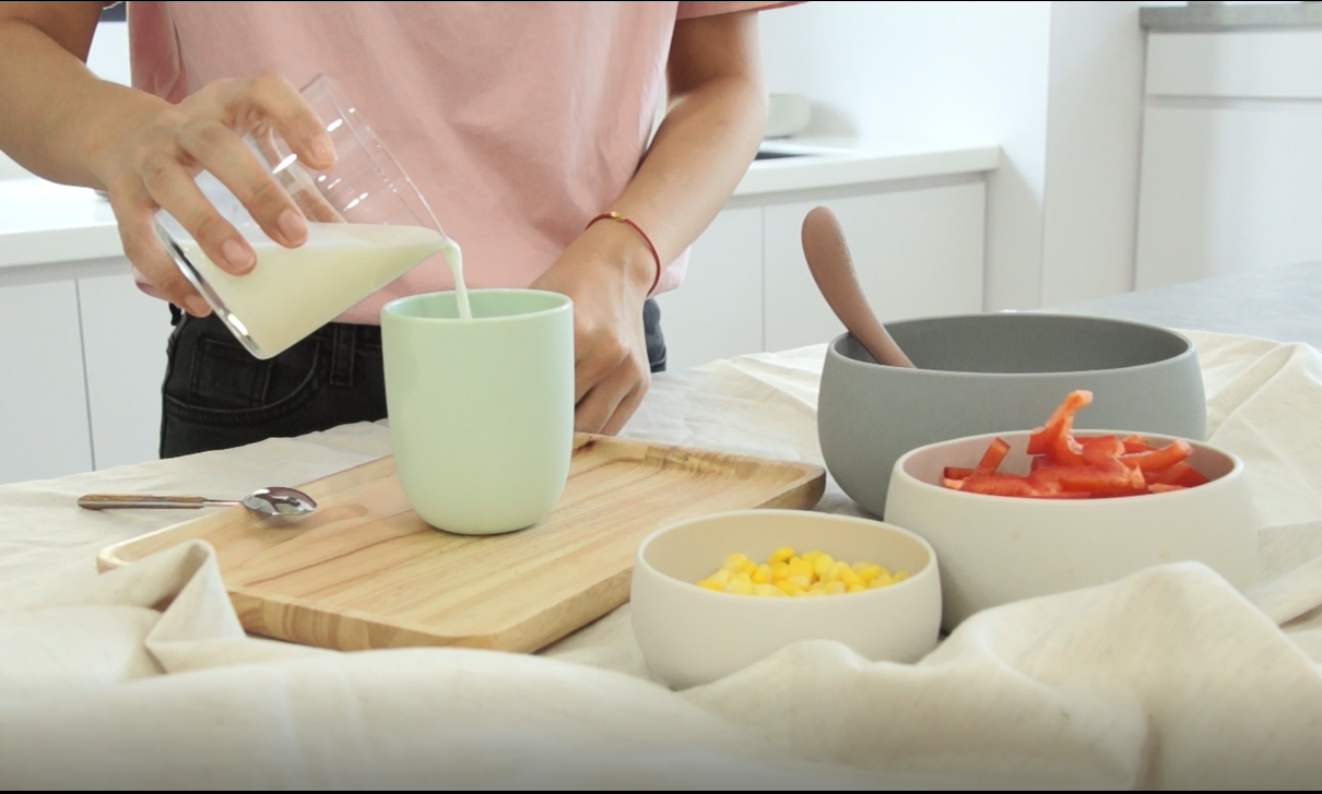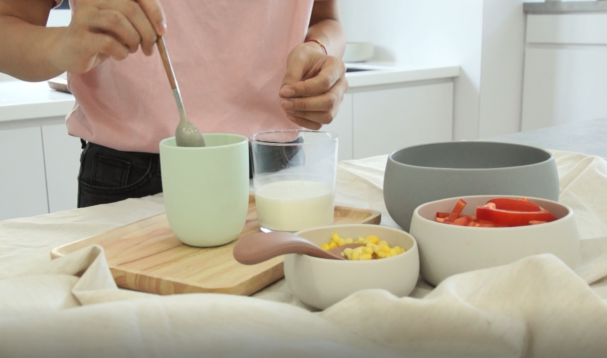 將兩顆蛋與牛奶加入小雙杯後,稍微攪拌