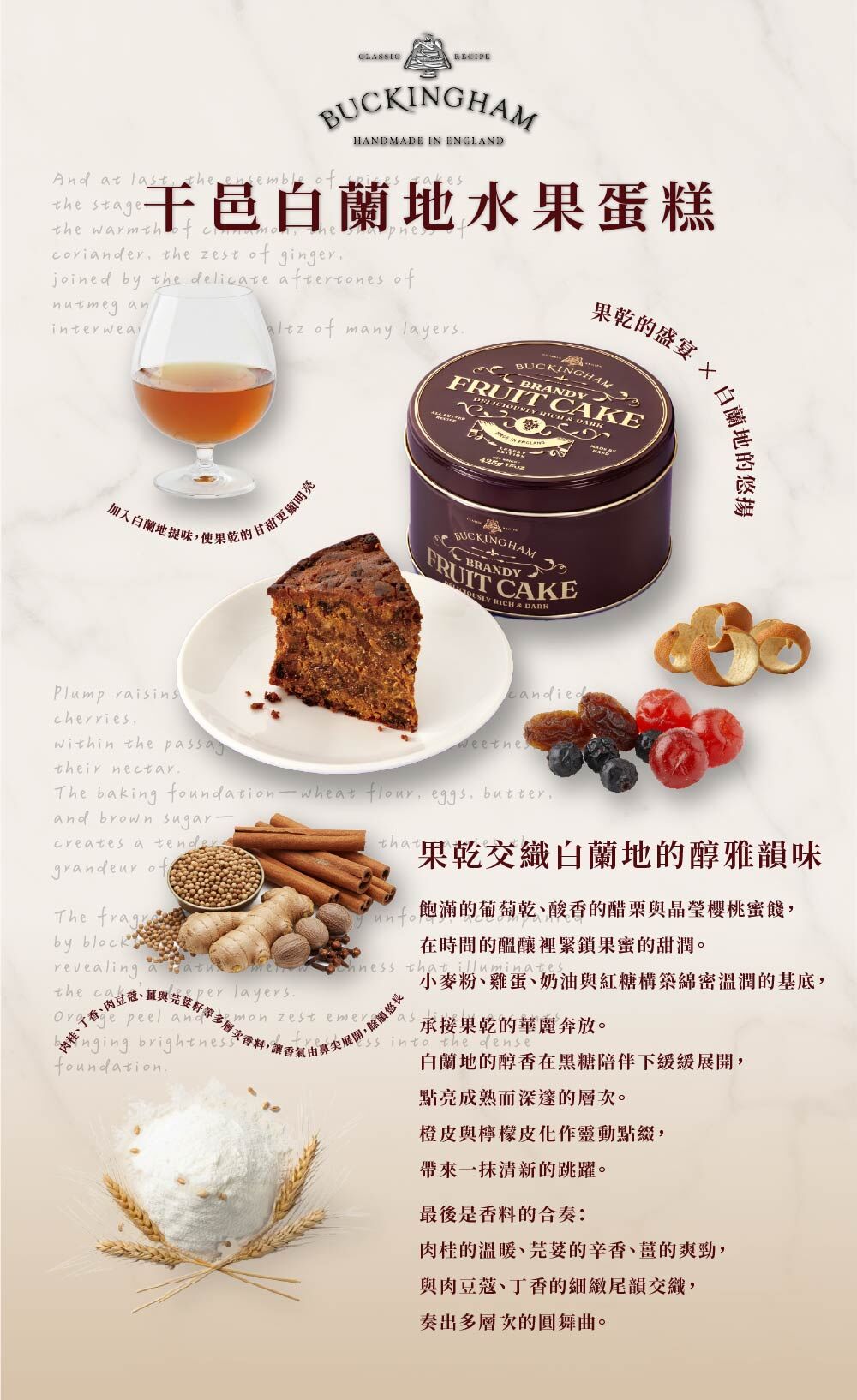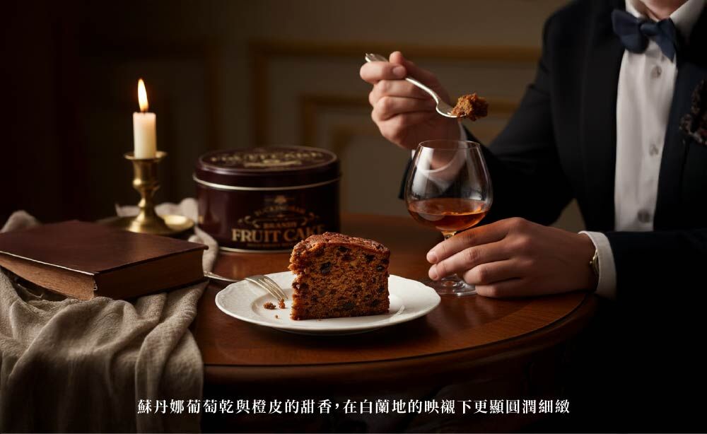 糖漬橙皮、櫻桃與葡萄乾在干邑白蘭地的提香下如音符般跳躍,蛋糕口感濕潤中帶著果蜜香甜,尾韻輕柔悠長。