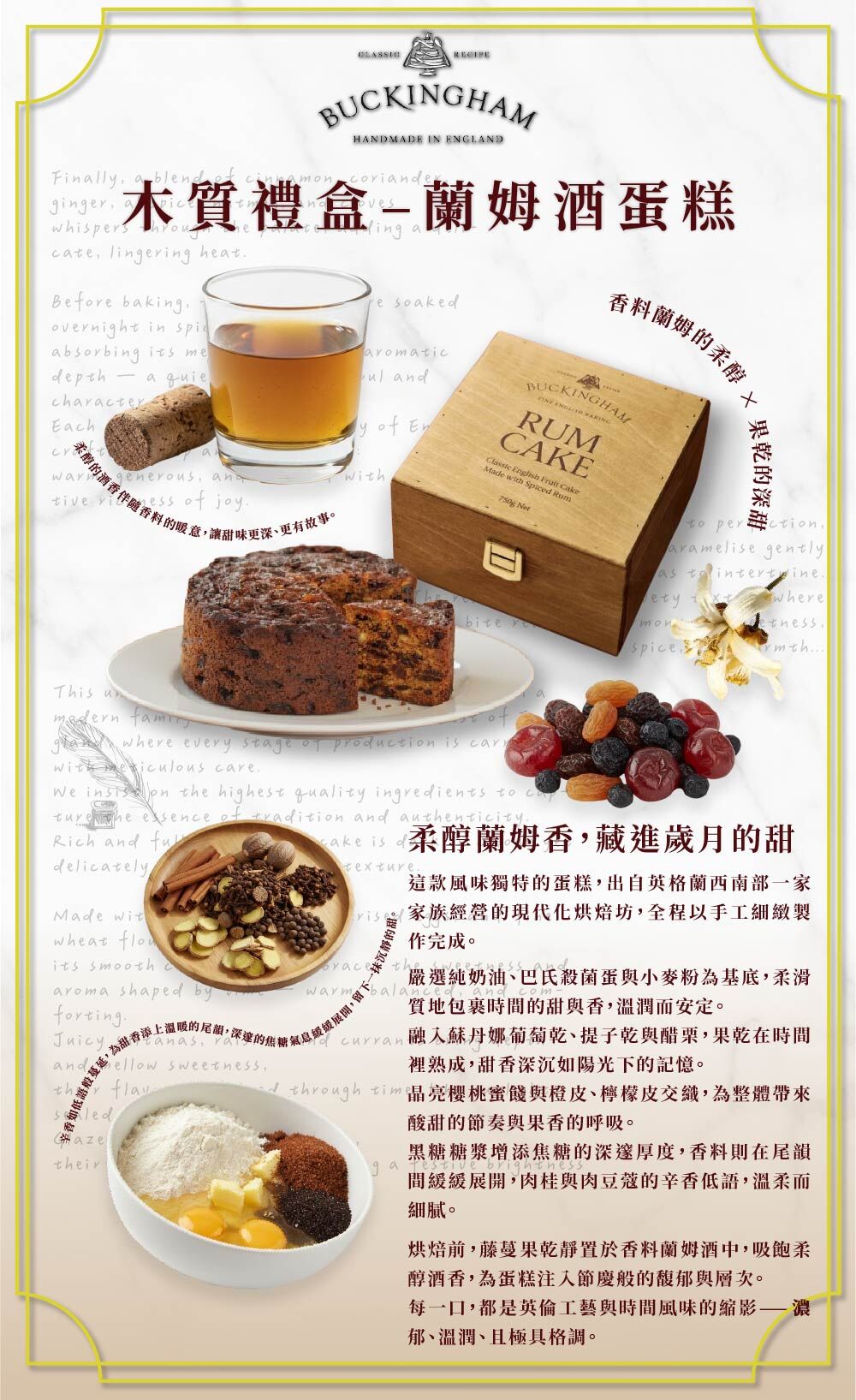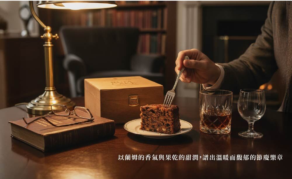當加勒比海風味的蘭姆酒,緩緩滲入多汁的蘇丹娜葡萄乾、醋栗與櫻桃,果香與酒氣在時間中層層交織,深邃而溫潤。切開蛋糕,濕潤綿密的質地中,蘭姆酒低語著香料的回甘,襯托出果乾的甜美奔放,層次豐富而不喧賓奪主。木盒封存這份濃情,是送給摯友、家人,或熱愛小酌之人的真摯禮遇。