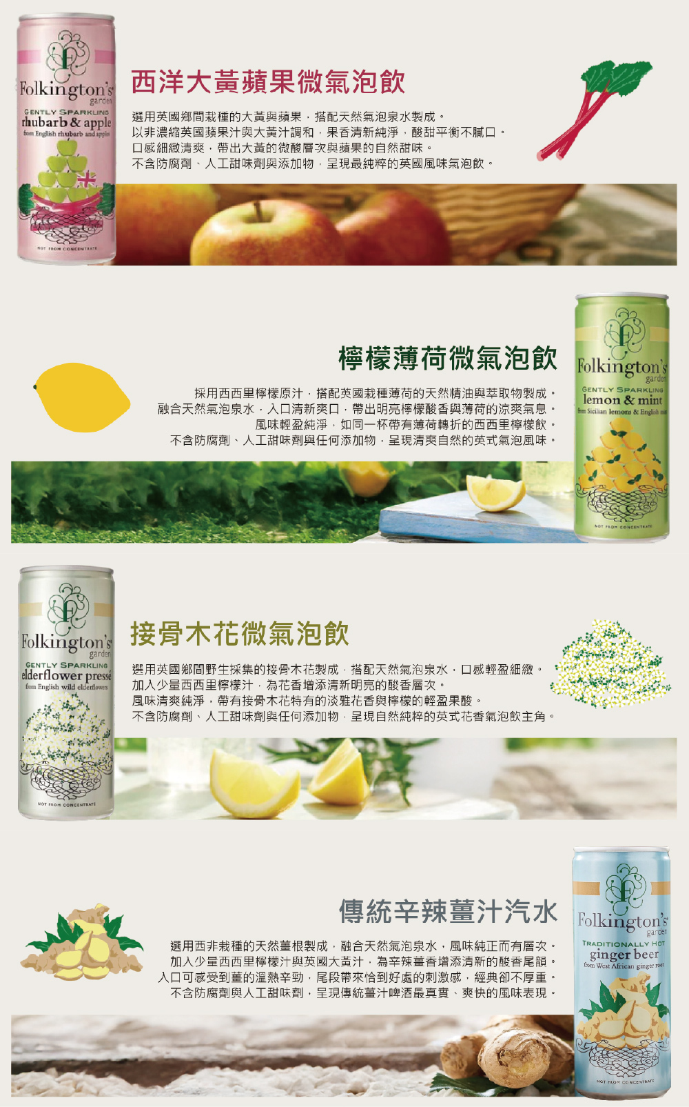 大黃蘋果、檸檬薄荷、接骨木花、傳統辛辣薑汁