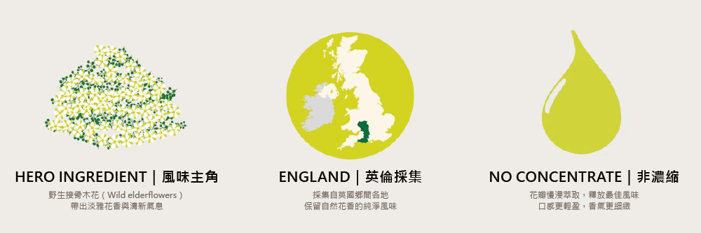選用英國鄉間野生採集的接骨木花,以花香為主調,帶出淡雅、乾淨、毫不甜膩的風味輪廓