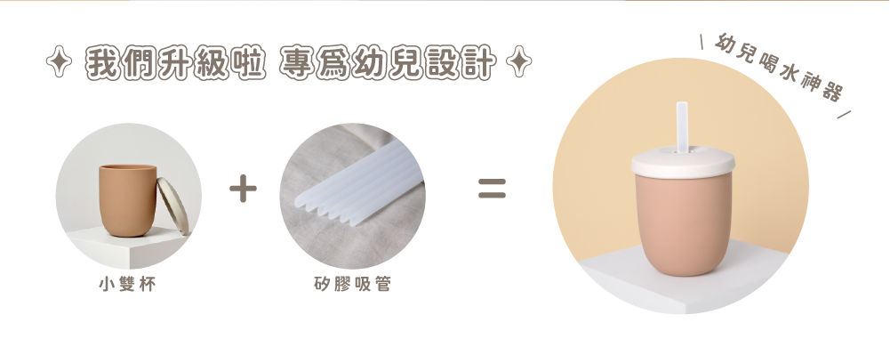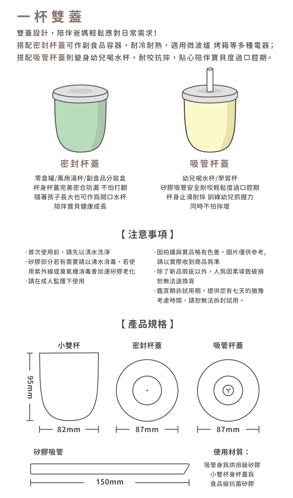 內容物:小雙杯身300ml、萬用杯蓋、吸管杯蓋、矽膠吸管