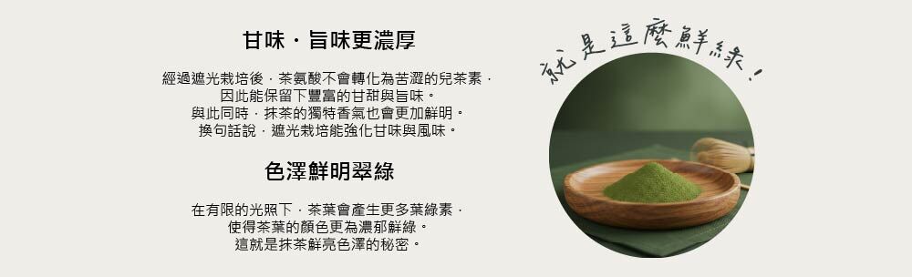 選用 碾茶(覆下栽培) 與抹茶,提升甘甜與旨味