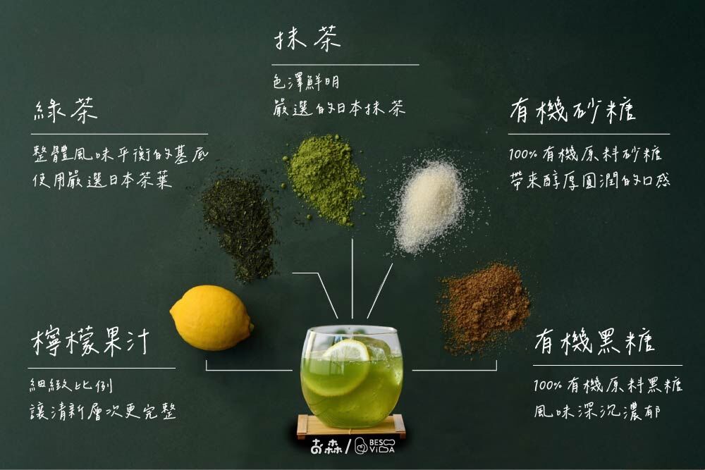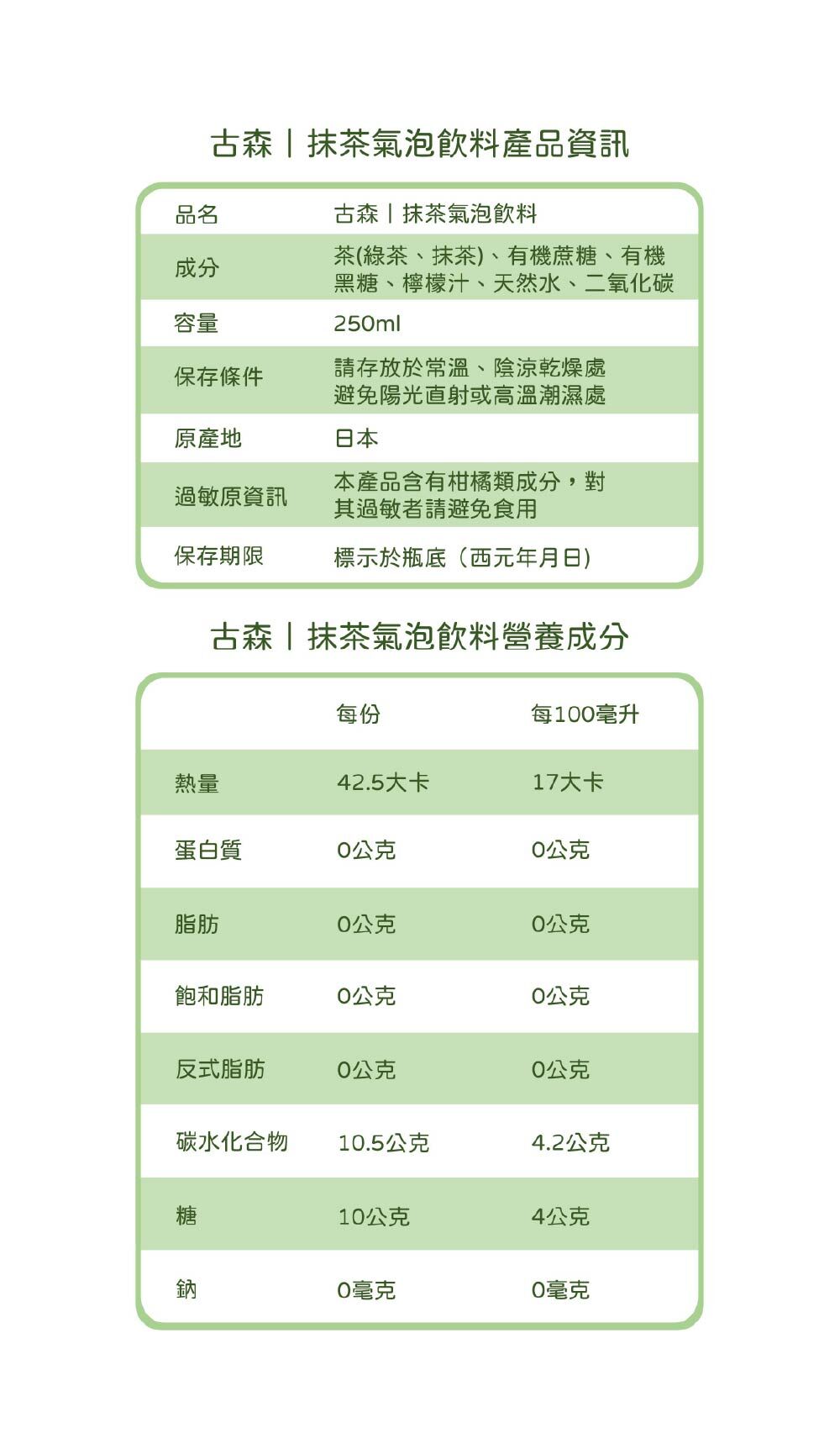 成分:抹茶、碾茶、有機蔗糖、有機黑糖、檸檬果汁、天然水、二氧化碳